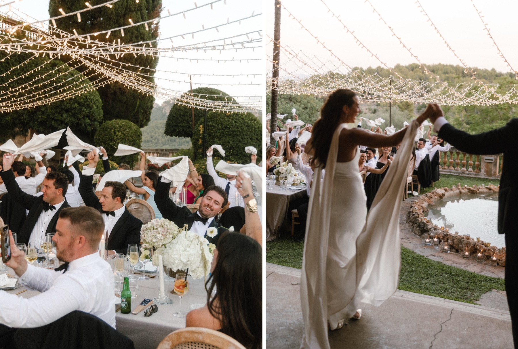 The ceremony took place in the courtyard at Son Togores – intimate, relaxed, and emotional in the best way. Afterward, guests gathered for a long cocktail hour by the pool, lingering conversations stretching into the afternoon. As the sun lowered, the celebration moved into the garden area by the fountain, where dinner was served under the open sky – one of those moments where time seems to slow down just enough.